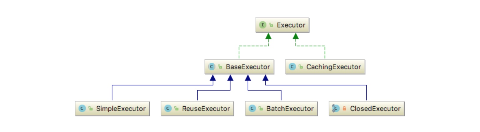Sqlsession是Mybatis对Sql执行的封装,真正的SQL处理逻辑要通过Executor来执行。Executor有多个实现类,因为在查询之前,要先check缓存是否存在,所以默认使用的是CachingExecutor类,顾名思义,它的作用就是二级缓存。