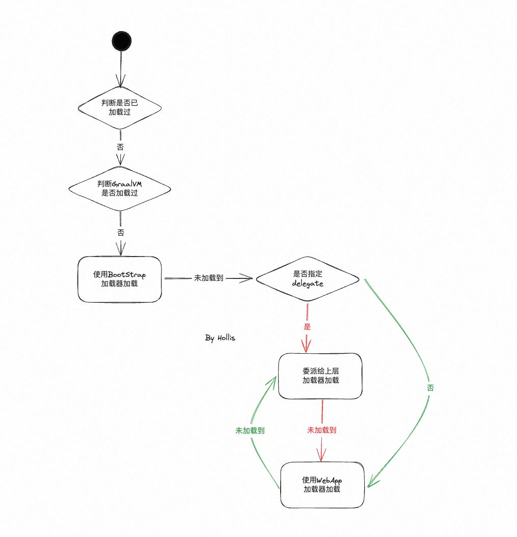 - 委派给父类加载器: 如果未指定需要委派(delegate为false),且自己没加载到类,则尝试使用父类加载器加载类。