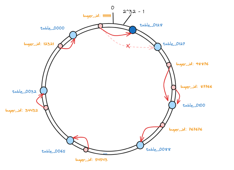 接下来, 我们把128张表作为节点映射到这些虚拟节点上,每个节点在哈希空间上都有一个对应的虚拟节点: