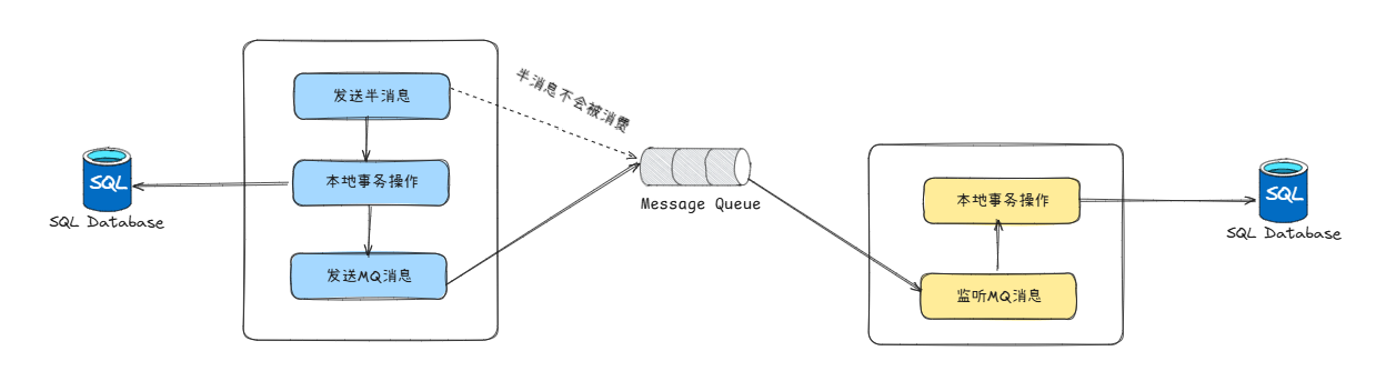 那么这个方案就是事务消息(RocketMQ中的那种,非Kafka中的那种),即把一个发送消息的过程拆成2步,先发一个半消息,确保成功之后,在执行本地事务,本地事务成功后,再发第二个半消息。