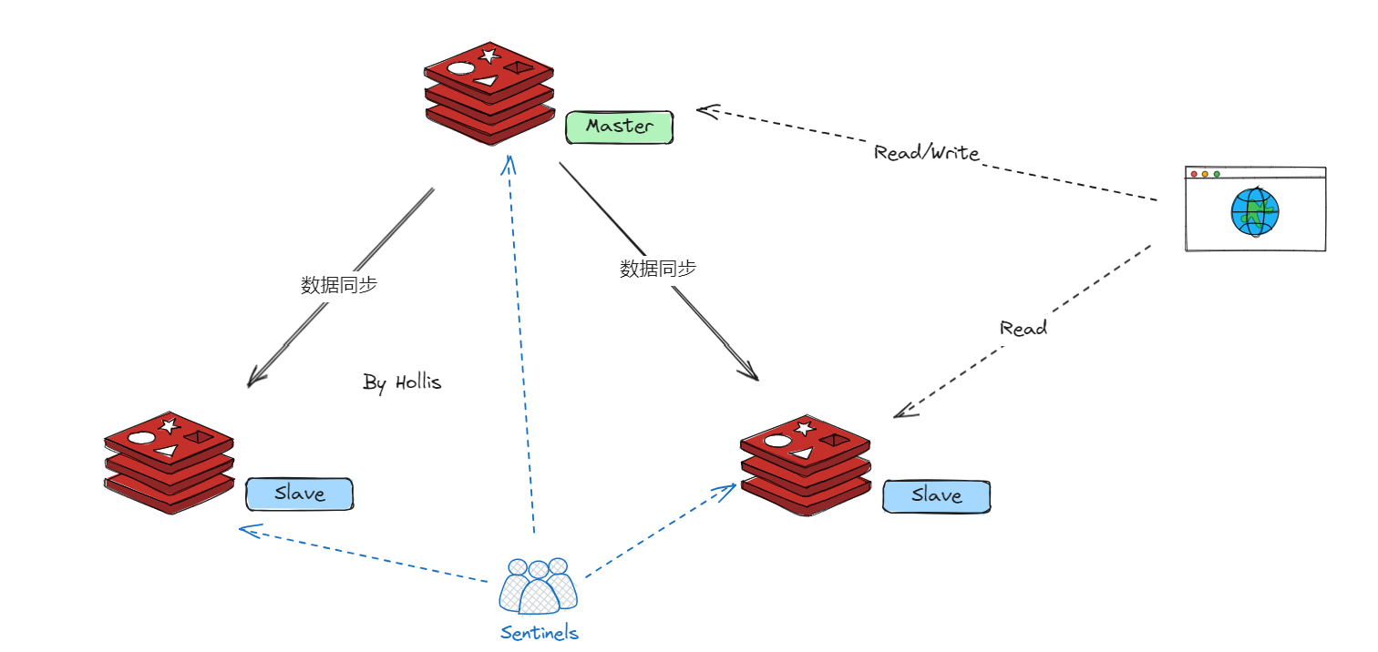 在原来的主从架构中,引入哨兵节点,其作用是监控Redis主节点和从节点的状态。通常需要部署多个哨兵节点,以确保故障转移的可靠性。