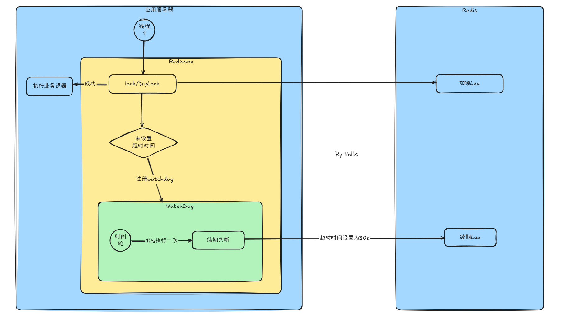 自动续租:当一个Redisson客户端实例获取到一个分布式锁时,如果没有指定锁的超时时间,Watchdog会基于Netty的时间轮启动一个后台任务,定期向Redis发送命令,重新设置锁的过期时间,通常是锁的租约时间的1/3。这确保了即使客户端处理时间较长,所持有的锁也不会过期。