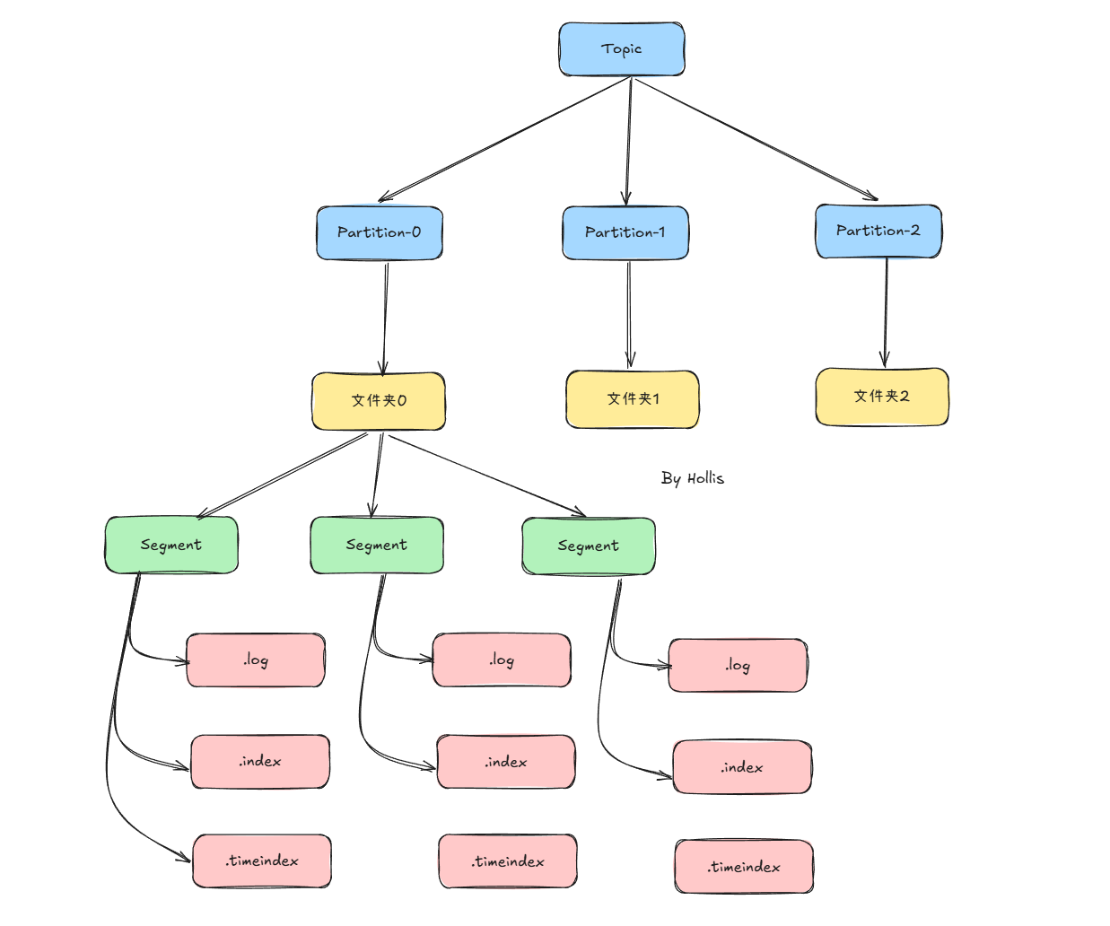 Kafka 的存储结构是一个从逻辑概念到物理文件的层级映射关系: