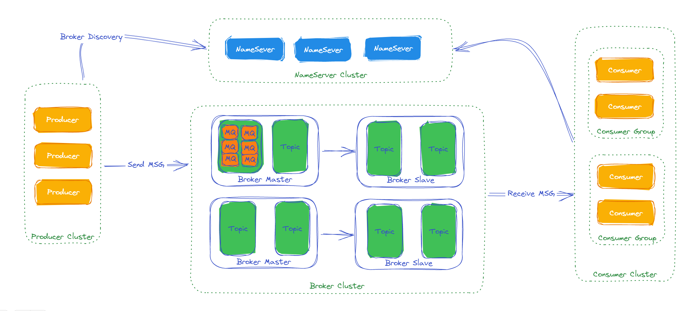 - Message Queue:消息队列,是Topic的物理实现。一个Topic可以有多个Queue,每个Queue都是独立的存储单元。Producer发送的消息会被存储到对应的Queue中,Consumer从指定的Queue中消费消息。