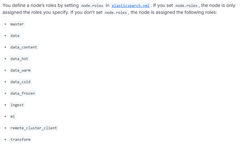官方文档中有关于目前支持的node roles的介绍:https://www.elastic.co/docs/deploy-manage/distributed-architecture/clusters-nodes-shards/node-roles