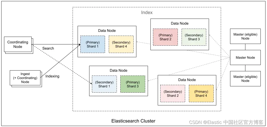 存储存储分片(包括主分片和副本分片)中的数据),执行CRUD 操作、搜索、聚合、排序等计算。数据节点是 CPU、内存和 I/O 密集型节点,需要强大的硬件资源。