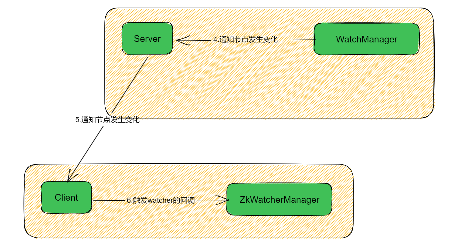 Zookeeper的watch机制实现中,涉及到多个概念,首先是客户端和服务端,这个好理解,Zookeeper的集群就是服务端,调用ZK服务的机器就是客户端。