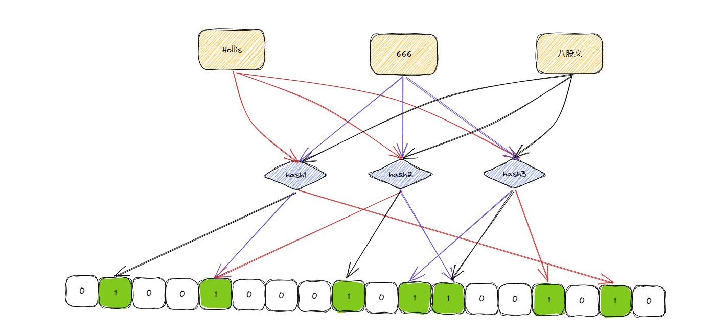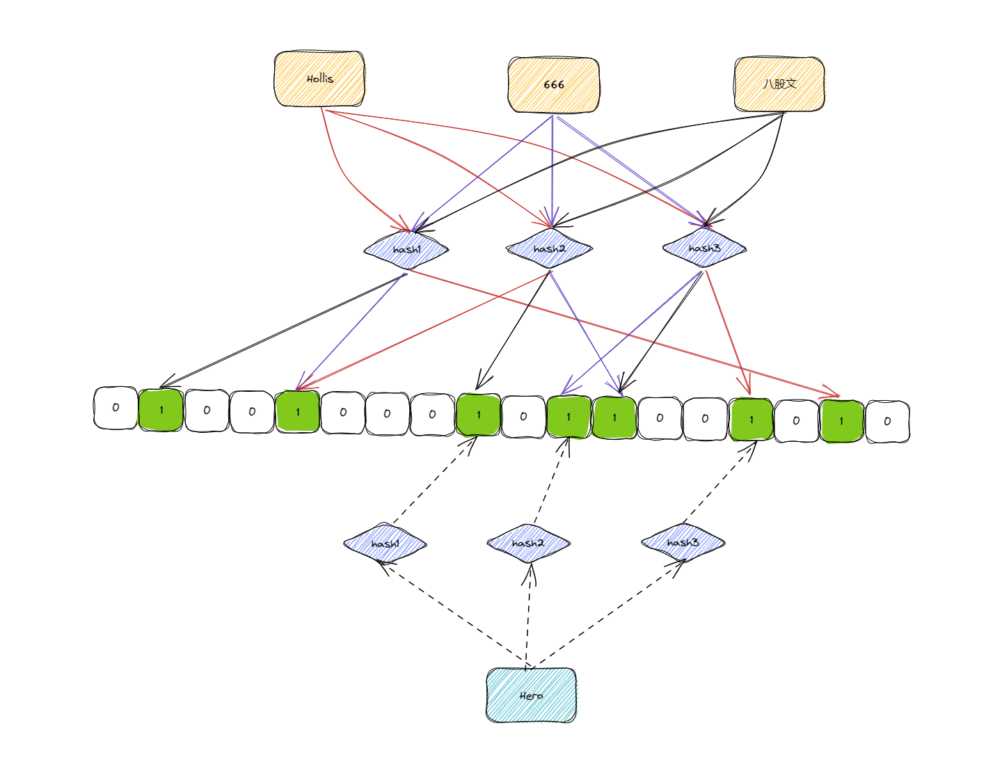 所以,布隆过滤器是存在误判的可能的,也就是当一个不存在的Hero元素,经过hash1、hash2和hash3之后,刚好和其他的值的哈希结果冲突了。那么就会被误判为存在,但是其实他并不存在。