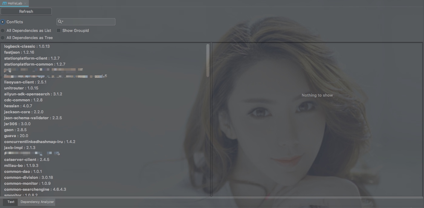 进入Dependency Analyzer视图之后有三个查看选项,分别是Conflicts(冲突)、All Dependencies as List(列表形式查看所有依赖)、All Dependencies as Tree(树结构查看所有依赖)。并且这个页面还支持搜索。