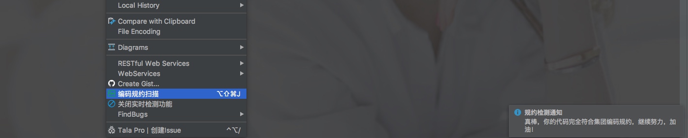 阿里巴巴规约插件包含三个子菜单:编码规约扫描、关闭试试检测功能。