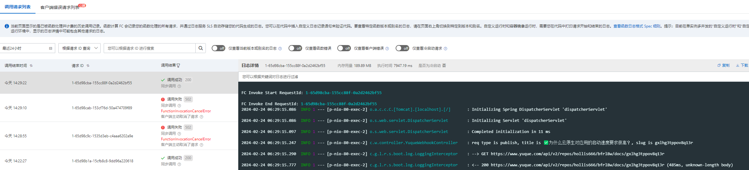 可以看到,前面几条日志就是应用的启动日志,也就是说平常服务是不启动的,有请求调用的时候才会启动,并处理。所以,这对应用的启动速度要求很高。