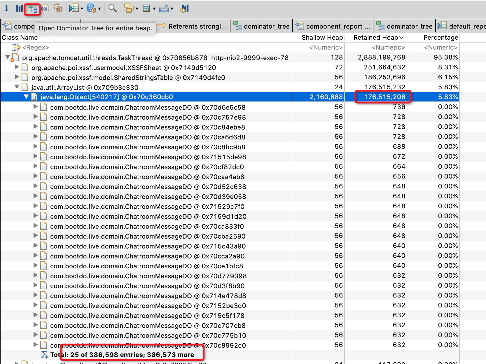 接下来使用堆分析工具MAT加载和分析 heapdump.hprof 文件。通过分析,我们发现存在大量的 org.apache.poi.xssf.usermodel.XSSFWorkbook 实例占用了大部分堆内存。