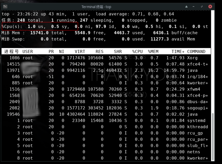 没有跑以上代码之前的CPU使用率下图所示,us代表用户态1%,sy代表内核态0.5%。