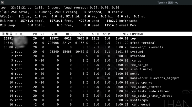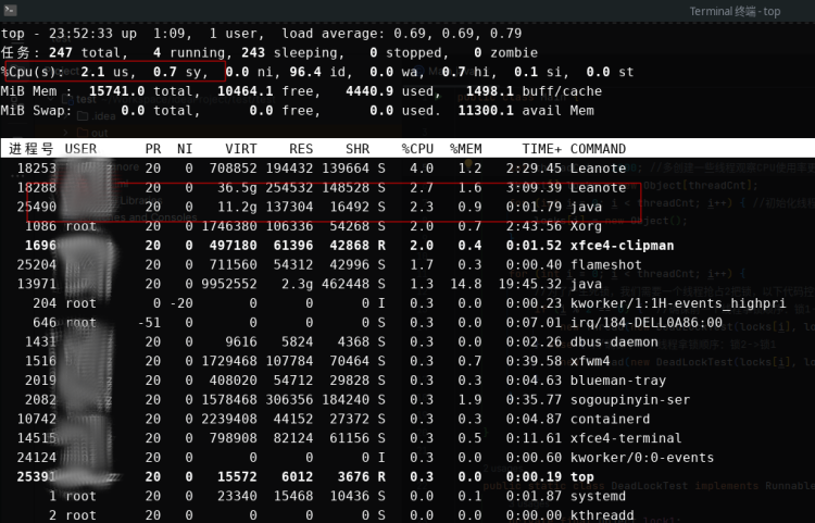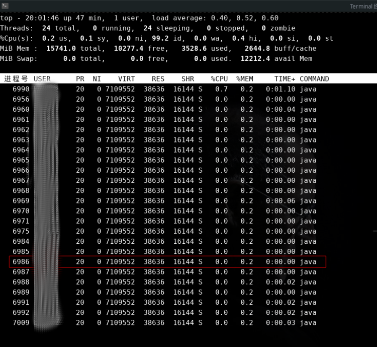 从图中可以看到CPU使用率并没有明显升高,java进程占用的CPU非常低。