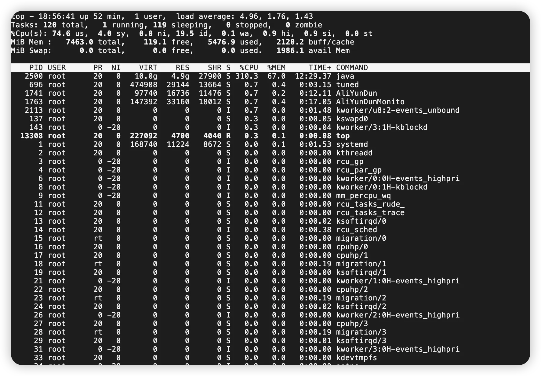 通过top命令查看CPU在300%以上,因为我们是4核的机器,所以基本上CPU利用率在80%以上了。