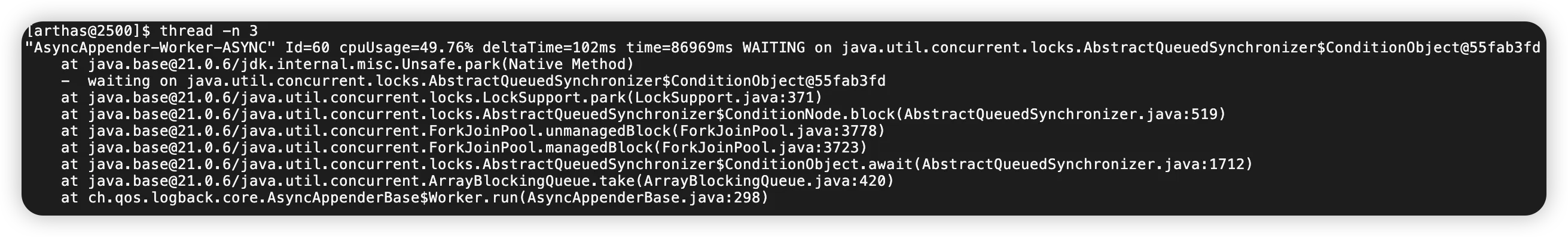 于是通过堆栈信息,发现这是一个和日志打印有关的代码。因为可以看到堆栈的最后一行,提示这个是logback的AsyncAppender的调用。