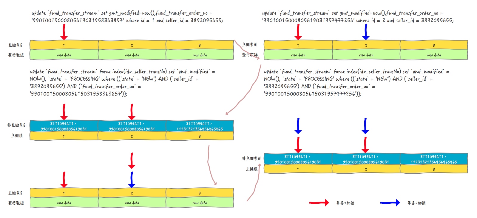 结合以上两张图,我们发现了导致死锁的原因: 事务1执行update1占用PRIMARY = 1的锁 ——> 事务2执行update1 占有PRIMARY = 2的锁; 事务1执行update2占有idx_seller_transNo = (3111095611,99010015000805619031)的锁,尝试占有PRIMARY = 2锁失败(阻塞); 事务2执行update2尝试占有idx_seller_transNo = (3111095611,99010015000805619031)的锁失败(死锁);