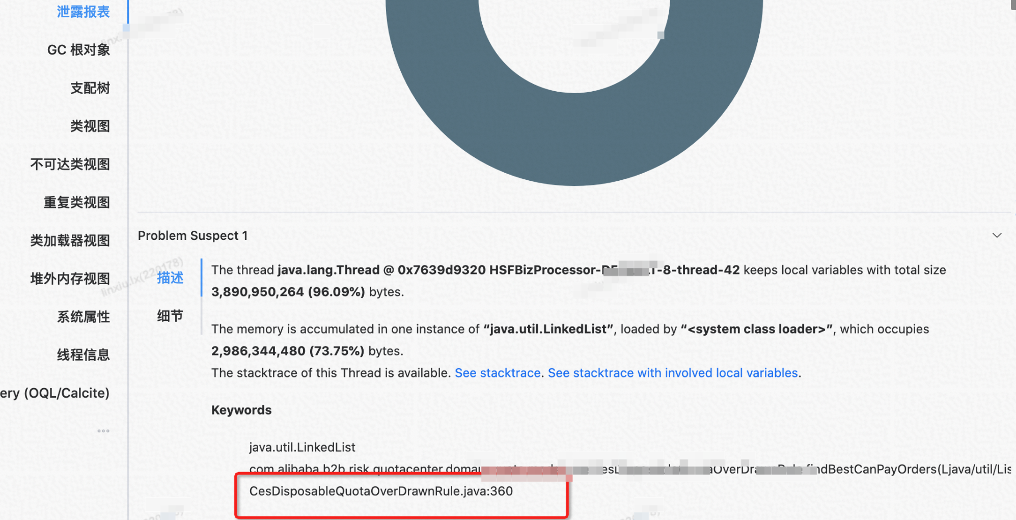 出现了这个现象之后,我们第一时间取拉了一下线上的堆DUMP。然后用我们的分析工具进行内存泄漏分析。
