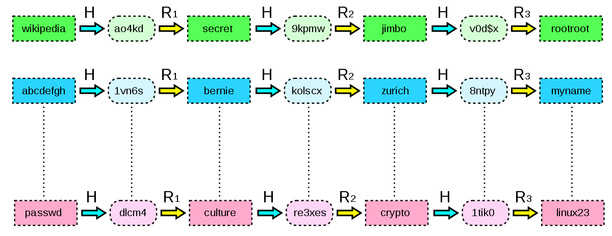彩虹表(rainbow table)是一个用于加密散列函数逆运算的预先计算好的表,常用于破解加密过的密码散列。 查找表常常用于包含有限字符固定长度纯文本密码的加密。这是以空间换时间的典型实践,在每一次尝试都计算的暴力破解中使用更少的计算能力和更多的储存空间,但却比简单的每个输入一条散列的翻查表使用更少的储存空间和更多的计算性能。