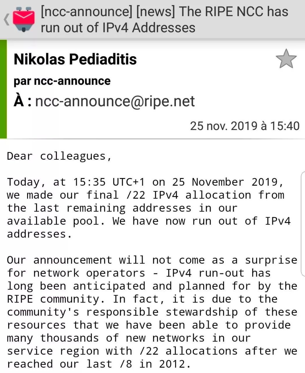 2019年11月25日,负责英国、欧洲、中东和部分中亚地区互联网资源分配的欧洲网络协调中心(RIPE NCC)宣布,其最后的 IPv4 地址空间储备池在 11 月 25 日 UTC + 1 15:35 完全耗尽,所有 43 亿个 IPv4 地址已分配完毕。