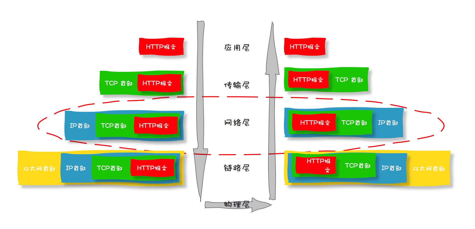 而在请求过程中,一个请求数据也会从应用层到物理层经过层层包装,每一层把上一层的数据报文包装后加上一层头部信息之后再传给下一层。