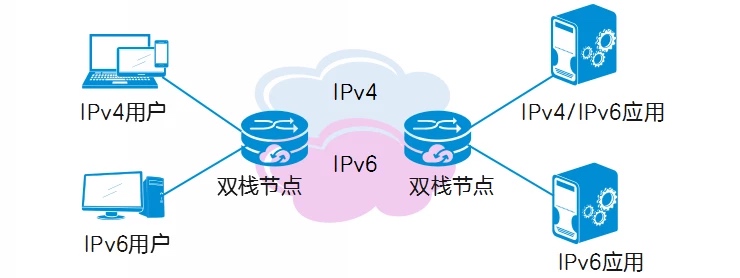 IPv4 和 IPv6 有功能相近的网络层协议,都是基于相同的硬件平台,同一个主机同时运行 IPv4 和 IPv6 两套协议栈,具有 IPv4/IPv6 双协议栈的结点称为双栈节点,这些结点既可以收发 IPv4 报文,也可以收发 IPv6 报文。它们可以使用 IPv4 与 IPv4 结点互通,也可以直接使用 IPv6 与 IPv6 结点互通。双栈节点同时包含 IPv4 和 IPv6 的网络层,但传输层协议(如 TCP 和 UDP)的使用仍然是单一的。