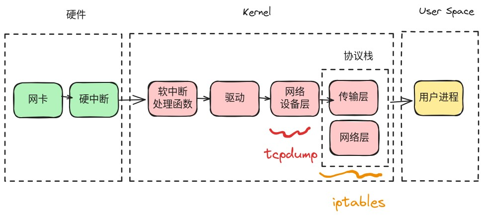 这里的一个重点:tcpdump在收包场景中位于iptables之前,所以能抓到被iptables INPUT链拦截的数据包。