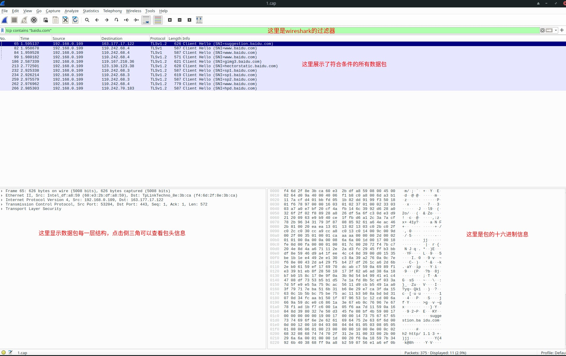 - http.request.uri,过滤指定http请求地址的数据包,如:http.request.uri matches 'baidu.com',注意matches是使用正则表达式模糊匹配