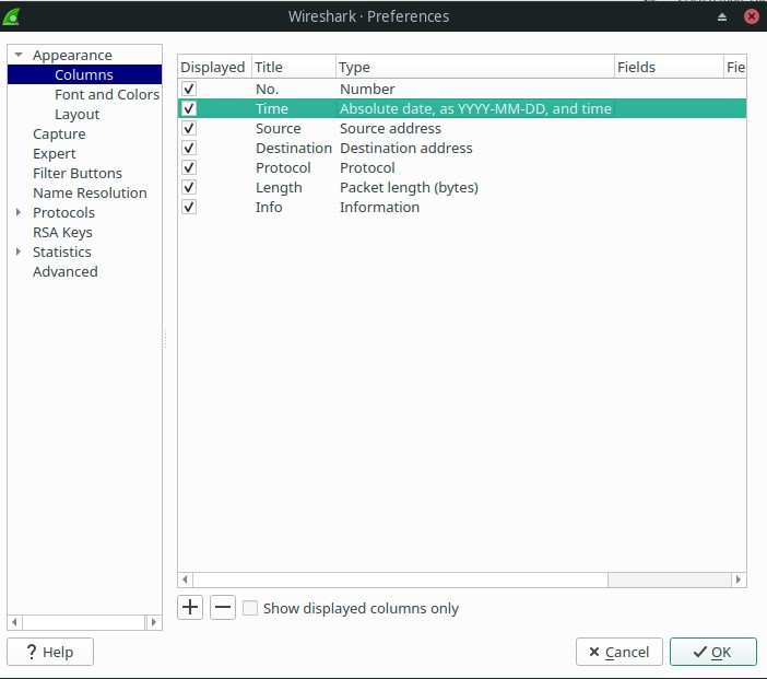 修改显示的时间格式,菜单栏Edit->Preferences->Appearance->Columns,修改Title为Time的Type列。这样有助于分析请求的耗时和发生时间