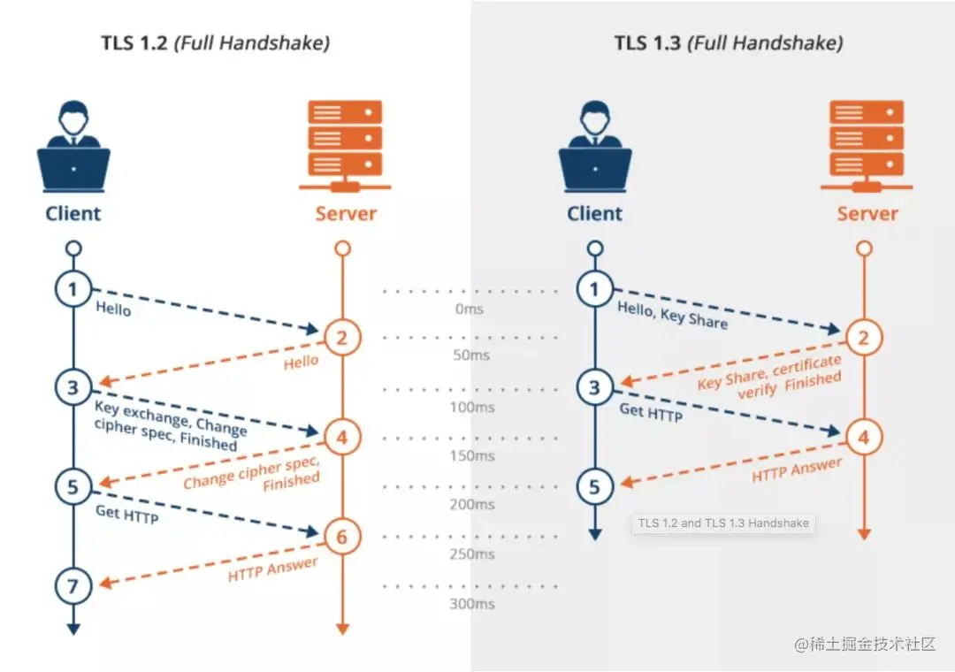 对于TLS 1.3来说,做了优化(1个往返,共2步):