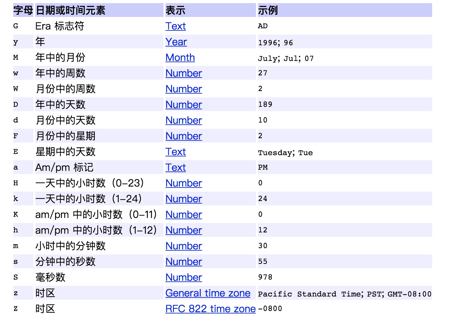 模式字母通常是重复的,其数量确定其精确表示。如下表是常用的输出格式的表示方法。