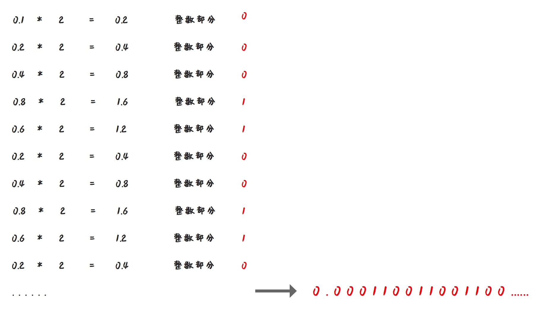 前面我们的例子中0.625是一个特列,那么还是用同样的算法,请计算下0.1对应的二进制是多少?