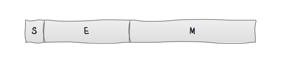 - E(exponent)表示N的指数位,位于S和M之间的若干位。对应值e值也可正可负。