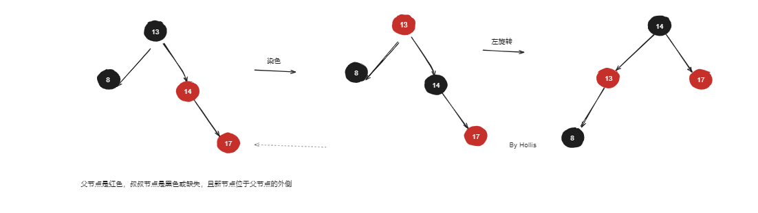 - 情况4:父节点是红色但叔叔节点是黑色或缺失,新节点是其父节点的右子节点而父节点是祖父节点的左子节点(或镜像情况)。