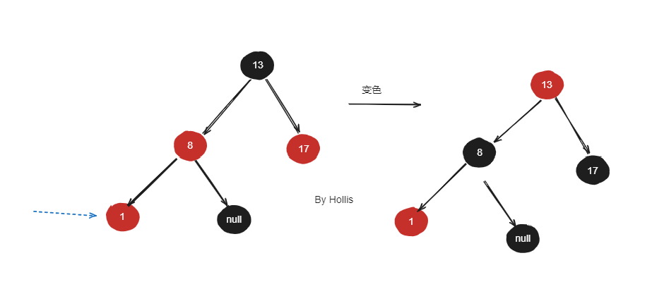 - 颜色变更:改变某个节点的颜色来维持红黑树的性质。