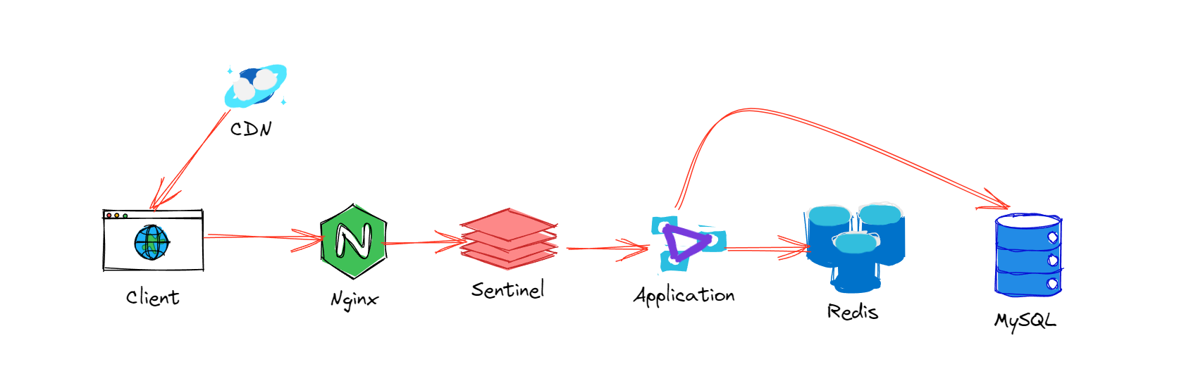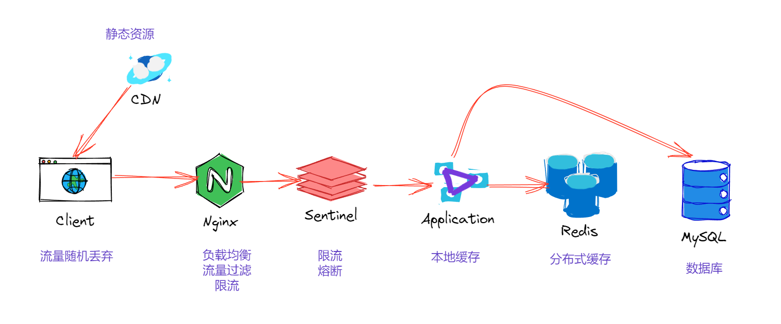 一般来说,我们在整体架构设计上面,会做逐层的流量过滤 ,一次用户的秒杀请求会经过客户端、CDN、Nginx、Web应用、缓存、数据库等等。