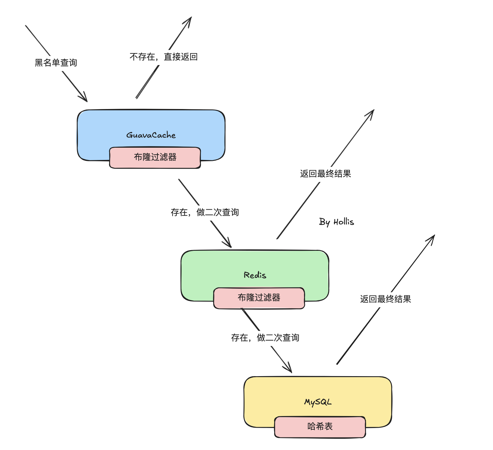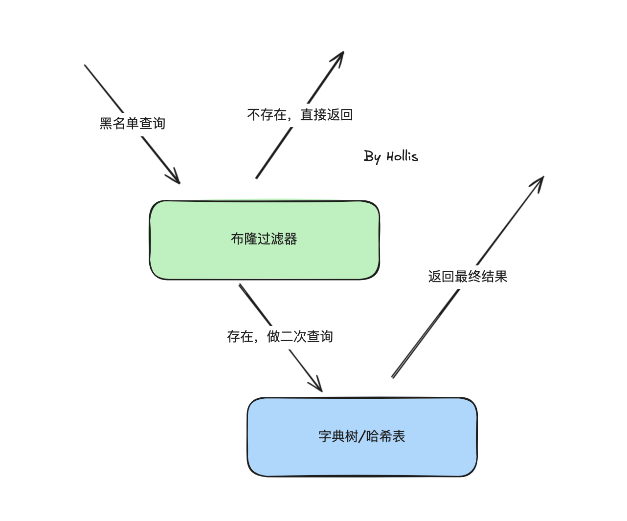 那么,就没有一个好一点的方案了吗。有,那就是组合防范,即基于布隆过滤器+哈希表/前缀树。布隆过滤器可以用作一个第一层的筛选器,如果判断元素不在黑名单中,则直接放行。如果认为元素可能在黑名单中,则进一步进行精确查找(如通过哈希表或Trie)。