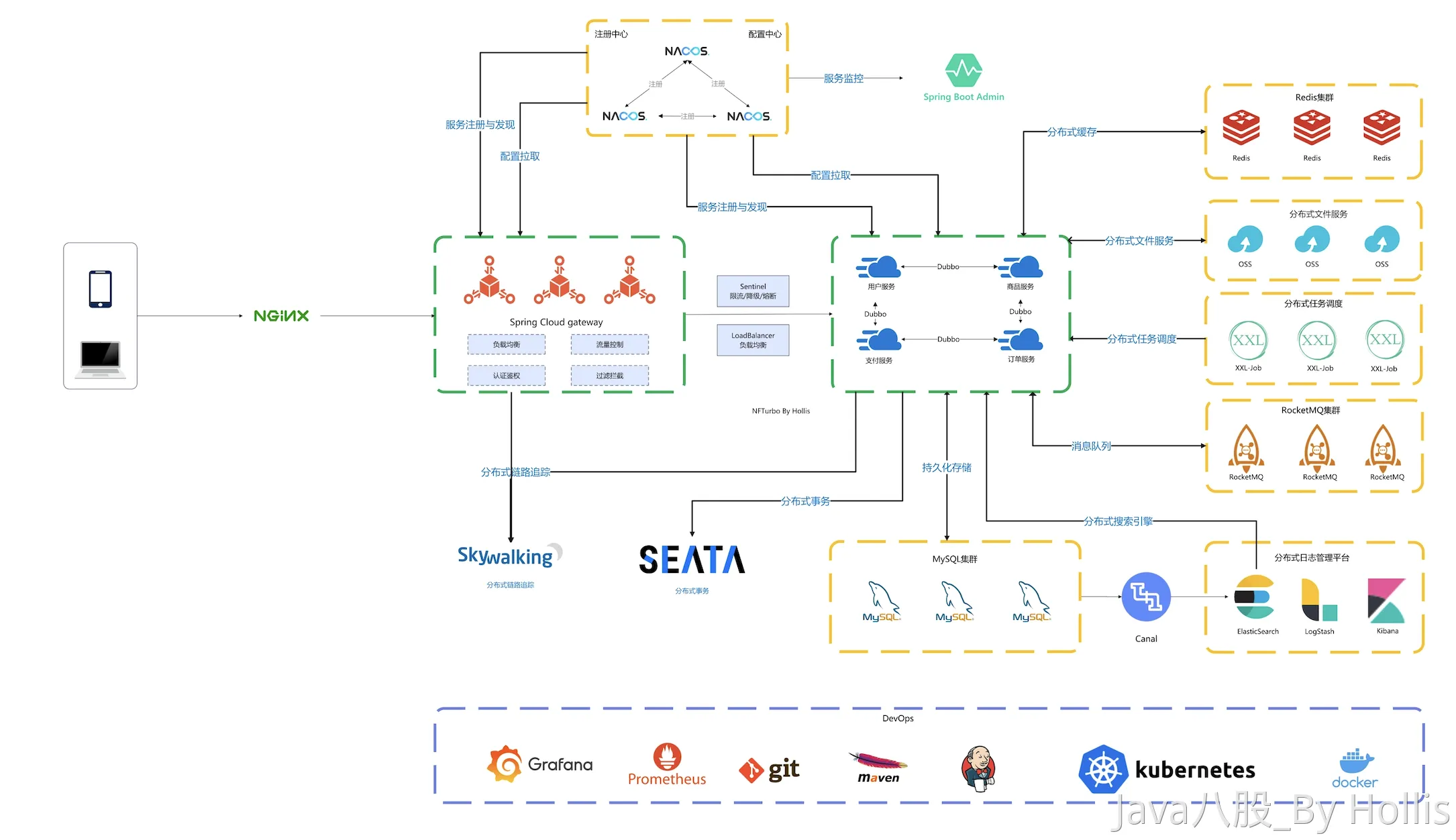 这是一个基于Spring Cloud搭建的分布式系统,通过SpringCloud Gateway我们搭建了一个统一的网关,然后各个微服务之间我们采用Dubbo做RPC的调用,异步消息这部分我们用了RocketMQ,存储的话主要用到了Redis做缓存,MySQL做持久化,定时任务采用的时XXL-JOB来实现的。项目中的一些海量数据的查询使用到了ElasticSearch来做的,里面的数据是通过Canal做同步的。还有一些限流相关的我们用了Sentinel实现。分布式事务这部分我们用了Seata作为分布式事务的协调组件。当然,项目中还有Nacos,包括我们的Gateway、Dubbo、Seata、Sentinel等等都依赖他来做注册中心和配置中心的。