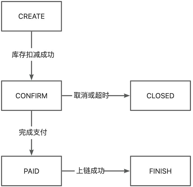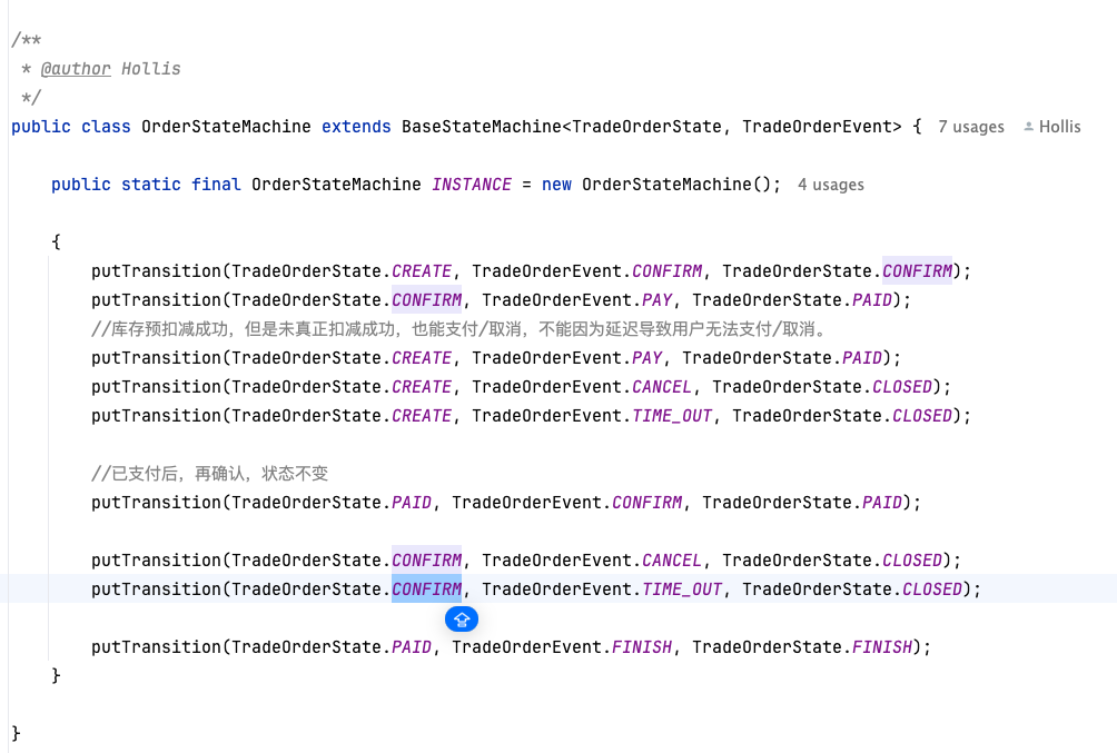 在我们的订单状态机的控制中,可以看到 CONFIRM 的状态,只能推进到 PAID 或者 CLOSED。