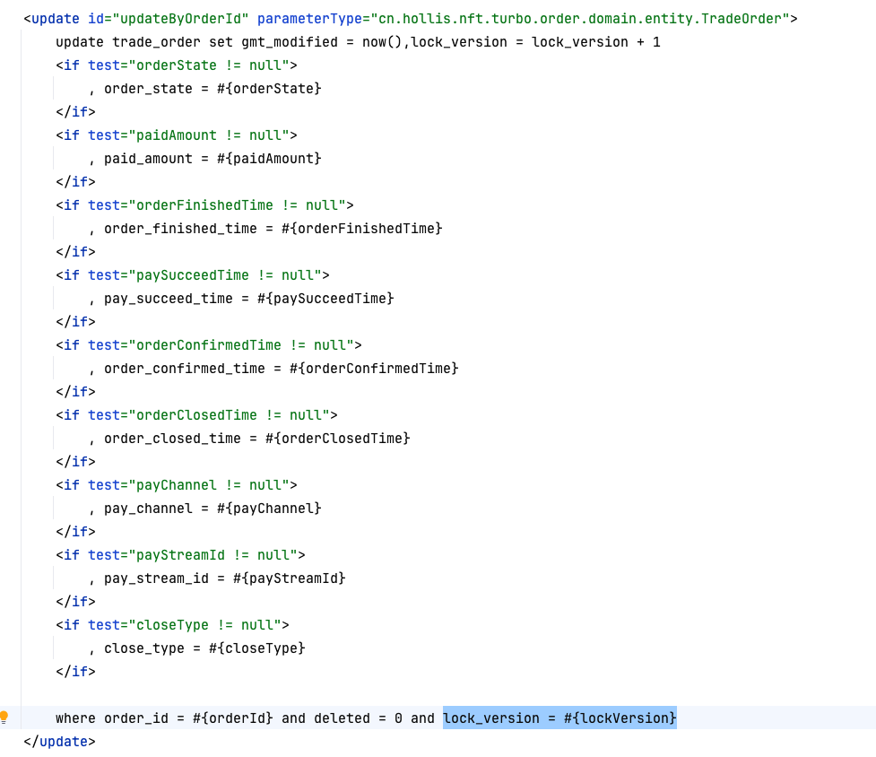 在我们的orderMapper.updateByOrderId方法中,是加了乐观锁的:
