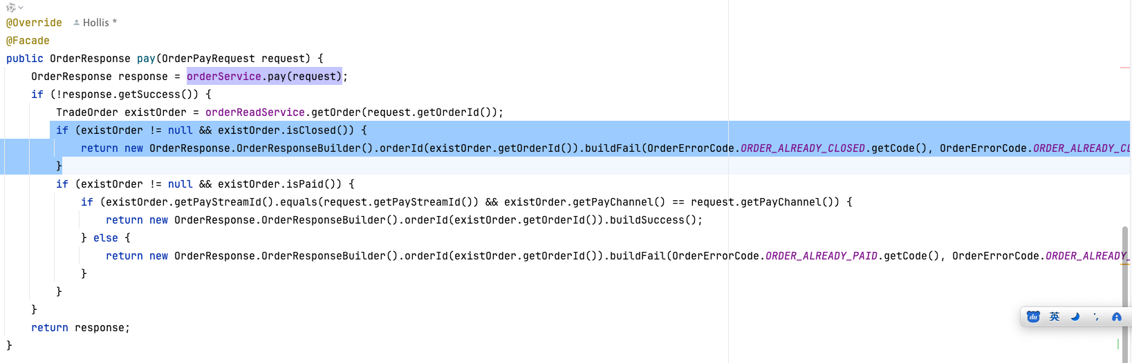 ORDER_ALREADY_CLOSED是什么情况才会有的呢,那么深入orderFacadeService.pay去看: