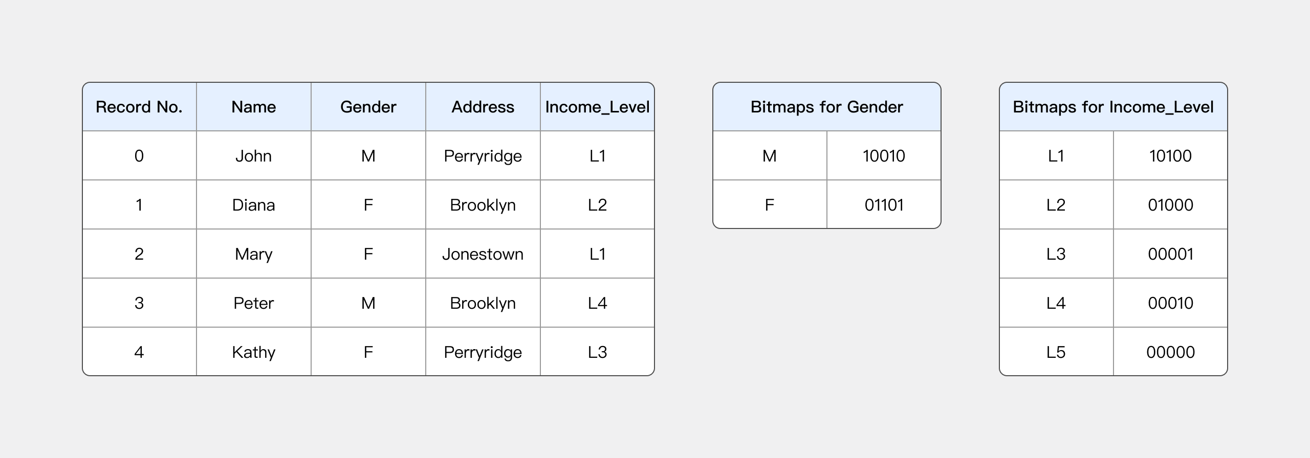 bitmap 索引将每个被索引的列的值作为 KEY,使用每个 bit 表示一行,当这行中包含这个值时,设置为 1,否则设置为 0。