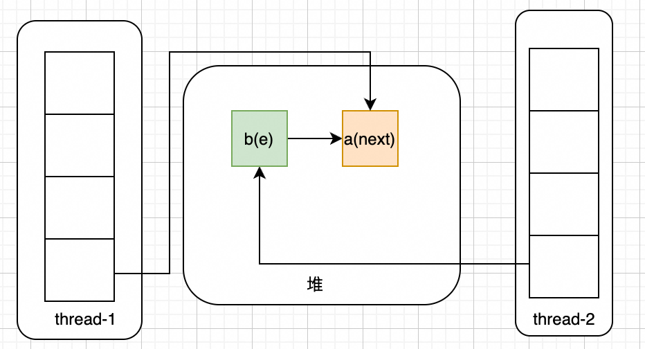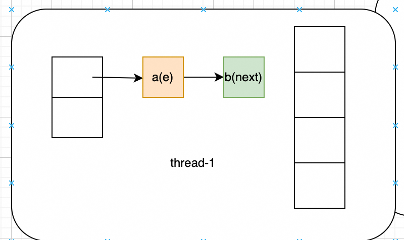 此时thread-1抢占到执行时间,开始执行:e.next = newTable[i]; newTable[i] = e; e = next;后,会变成如下样式: