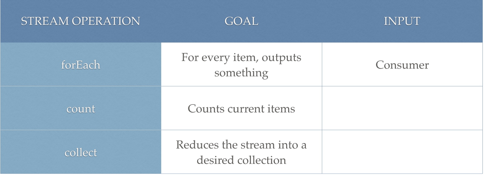 Stream的中间操作得到的结果还是一个Stream,那么如何把一个Stream转换成我们需要的类型呢?比如计算出流中元素的个数、将流装换成集合等。这就需要最终操作(terminal operation)