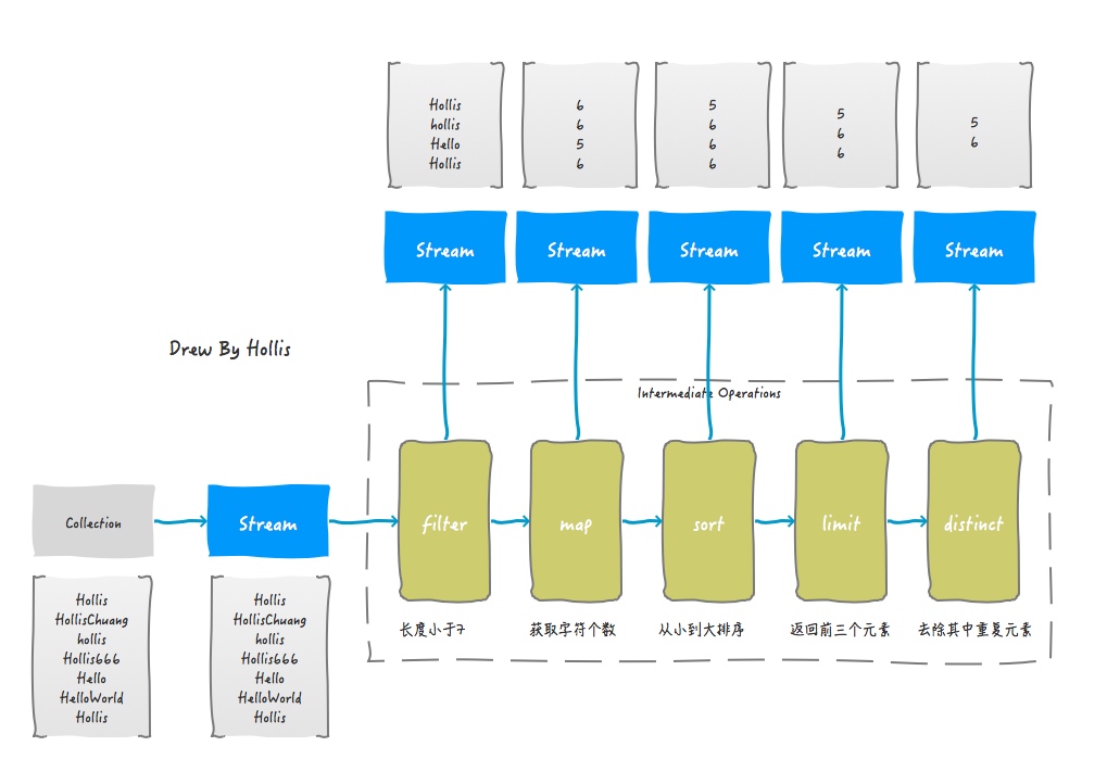 接下来我们通过一个例子和一张图,来演示下,当一个Stream先后通过filter、map、sort、limit以及distinct处理后会发生什么。