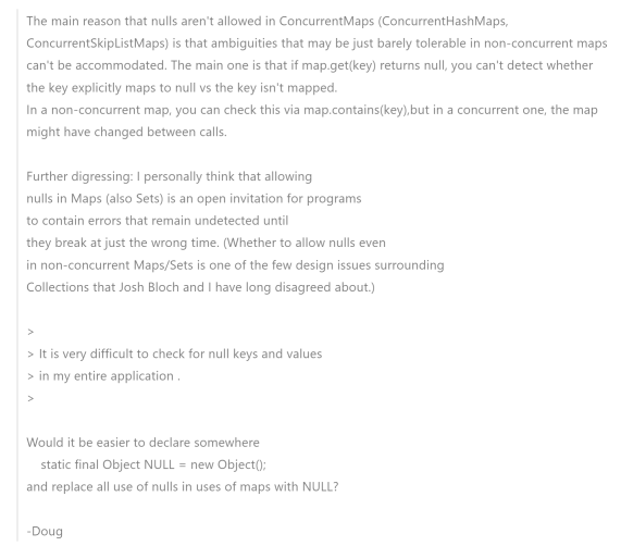 ConcurrentMap(如ConcurrentHashMap、ConcurrentSkipListMap)不允许使用null值的主要原因是,在非并发的Map中(如HashMap),是可以容忍模糊性(二义性)的,而在并发Map中是无法容忍的。