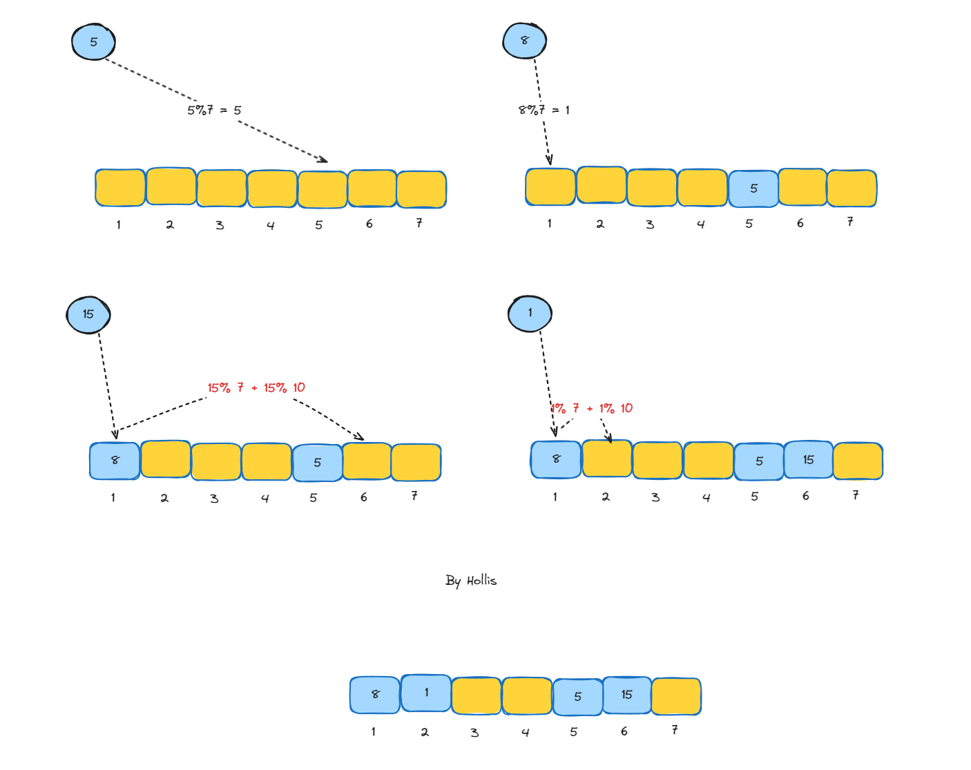 如使用大小为7的hash表,依次存储5、8、15、1