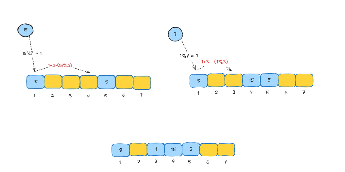 同样是依次存储5、8、15、1,假设第二个哈希函数为 hash2(key) = 3 - (key % 3)。