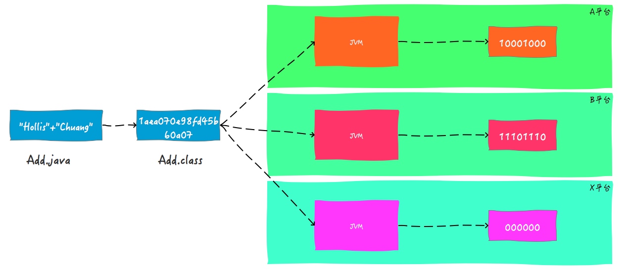 有了Java虚拟机,想要执行a+b操作,A操作系统上面的虚拟机就会把指令翻译成10001000,B操作系统上面的虚拟机就会把指令翻译成11101110。