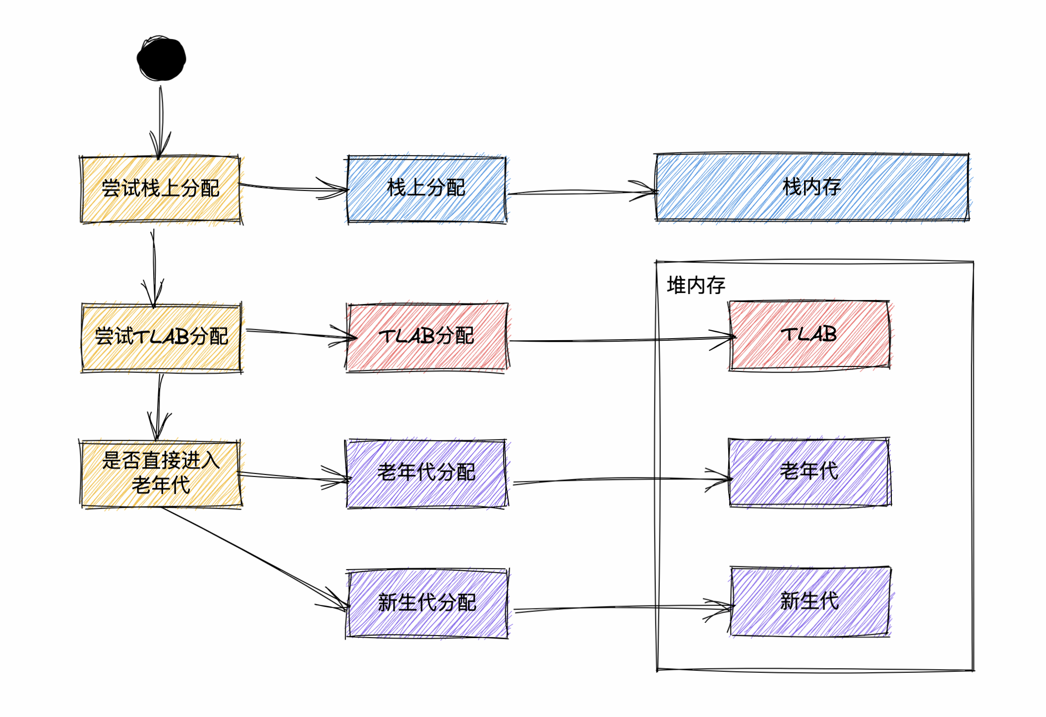 - 否则对象主要分配到新生代上,如果启动了TLAB,则分配到TLAB中。
